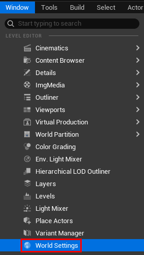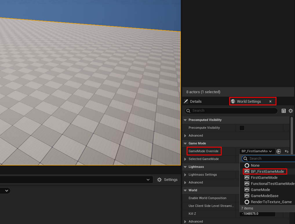 만약 레벨 별로 설정하고 싶다면 Window -> World Settings에서 현재 열려 있는 레벨의 GameModeOverride로 게임모드를 지정할 수 있다. 이렇게 하면 이 특정 레벨은 프로젝트 전역 게임모드 대신 따로 설정한 게임모드를 사용하게 된다.