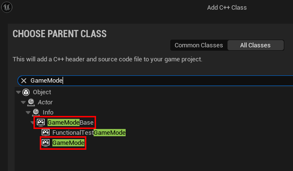 GameMode 클래스를 생성하려 검색하면 GameModeBase와 GameMode 두 가지가 뜨는데 GameModeBase는 단순화 된 형태로 멀티플레이 관련 로직이 거의 포함되어 있지 않고 싱글 플레이 게임을 구현할 때 주로 사용한다.(비교적 간단한 게임)