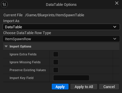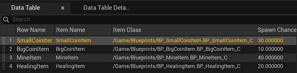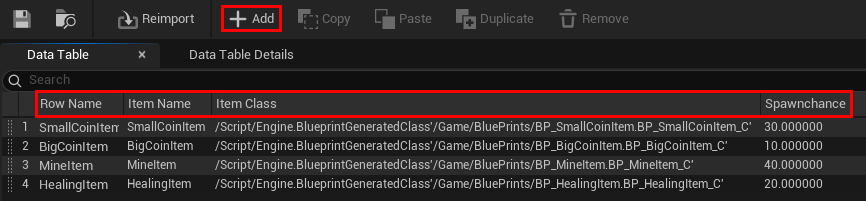 처음 키면 원래는 다 비어있고 구조체에서 만든 Item Name, Item Class, Spawnchance만 있다.