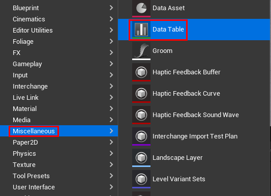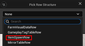 우클릭을 해서 Miscellaneous->Data Table을 선택해서 생성하고 만들어둔 ItemSpawnRow를 적용한다.