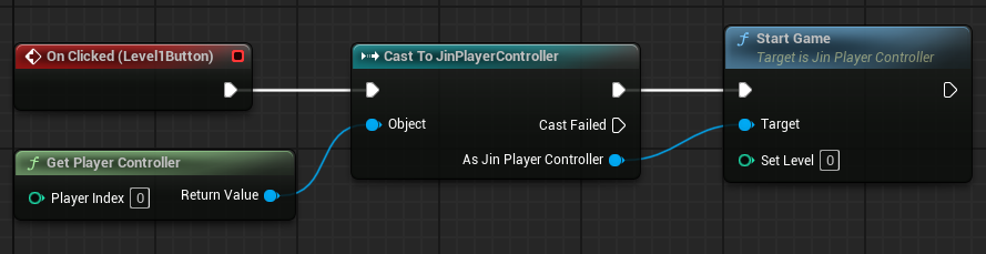 레벨 버튼이 클릭되면 플레이어 컨트롤러를 JinPlayerController로 Cast하고 성공시 StartGame 함수 실행.