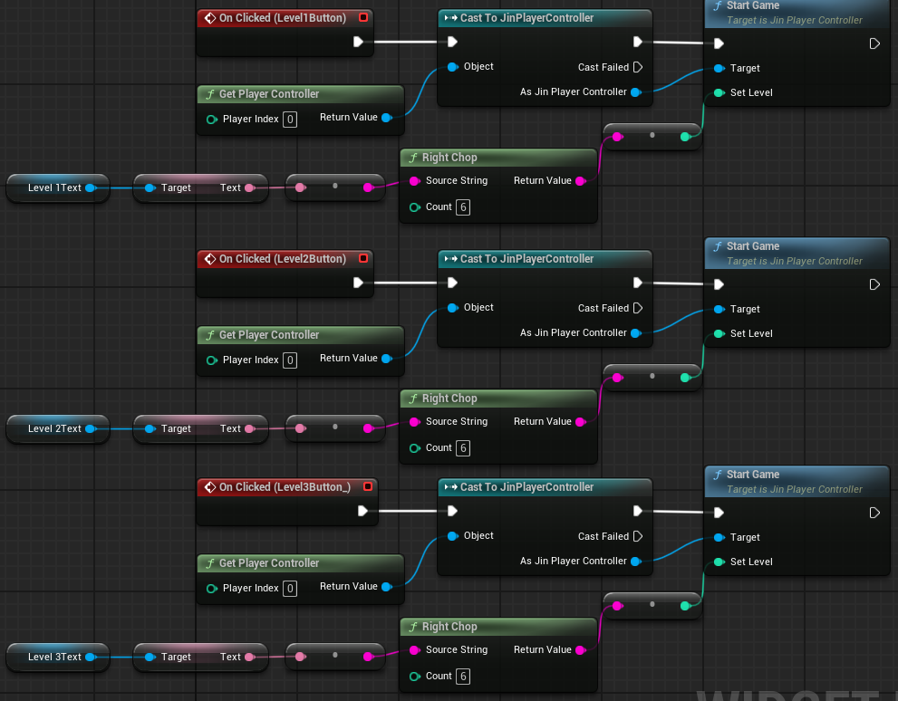 레벨 버튼의 텍스트를 변수로 만들어서 GetText로 FText만 뽑고 이를 FString으로 변환해서 RightChop을 사용해서 필요한 문자열(끝의 숫자)만 뽑아냄. RightChop은 왼쪽의 문자를 Count만큼 제거하는 함수다.("Level " = 6)