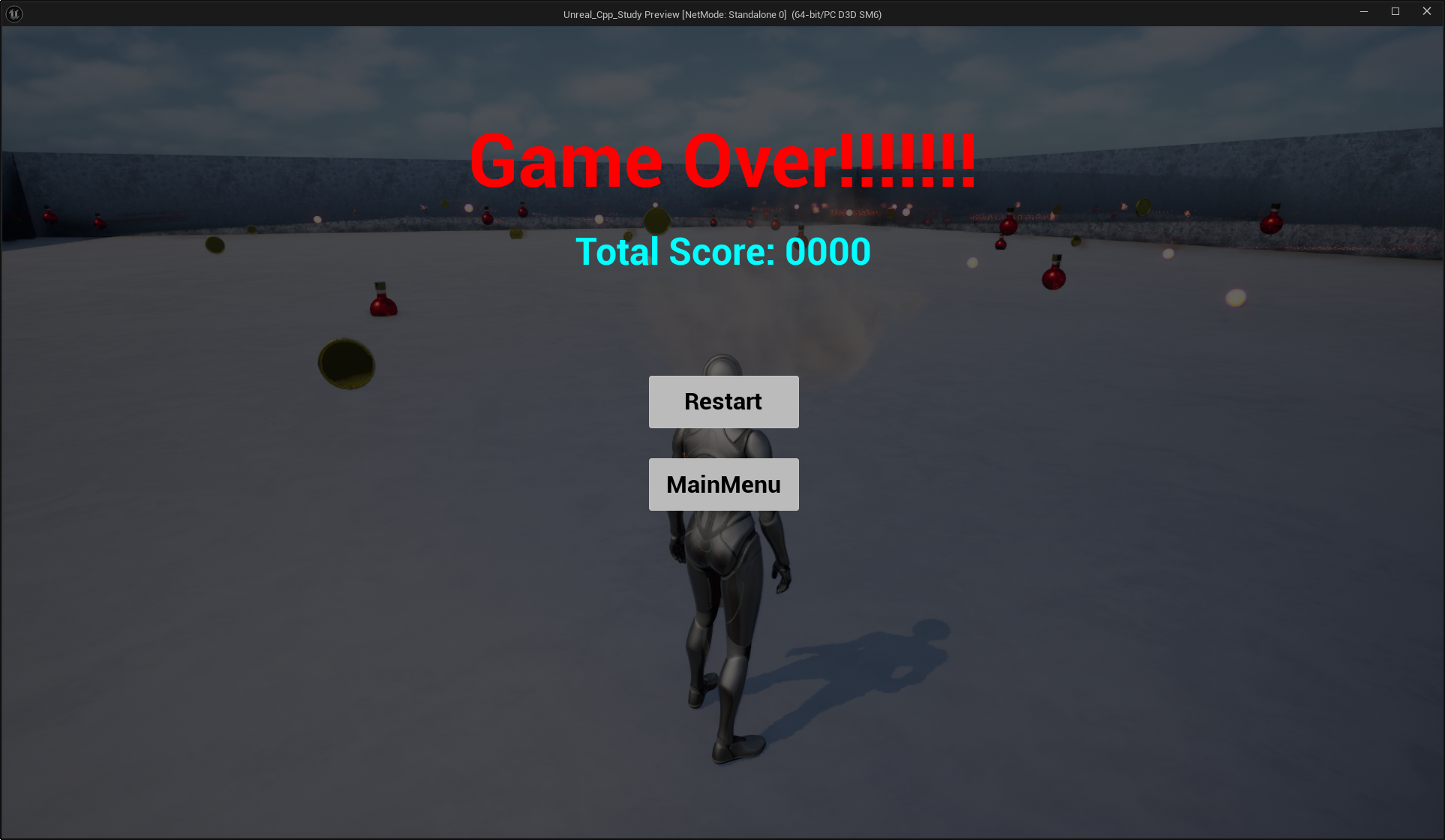 JinPlayerController에 ShowGameOverMenu 함수를 만들어서 구현했다.