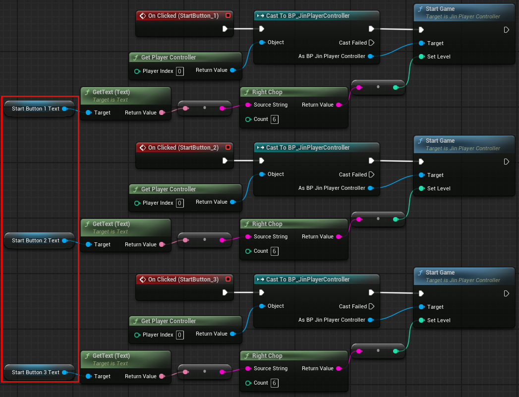 StartGame의 SetLevel에 Level 버튼의 끝 숫자를 넣어주기 위해 텍스트 블럭을 변수로 만들고 Text를 가져와서 String형으로 변환 후 RightChop 함수로 왼쪽 문자열 Count만큼 삭제하고 Int형으로 변환 후 SetLevel에 넣기.