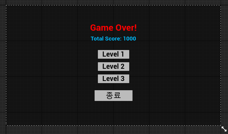 버튼은 Restart 버튼을 누르면 어떤 레벨(웨이브)부터 시작할 지 레벨 버튼이 표시되고 MainMenu 버튼을 누르면 MainMenu 위젯이 띄워지도록 구현할 예정이다.