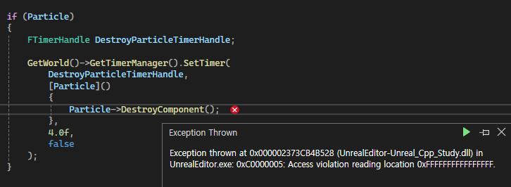 아직 약한참조와 람다함수를 잘 몰라서 100% 이해를 하진 못했지만 현재 이해한 바로는 SetTimer로 4초 후에 람다 함수를 호출하고 호출될 때 Particle이 파괴된 상태면 DestroyComponent 함수가 호출되지 않도록 구현하여 중복으로 Destroy되는 문제를 해결한 것 같다.
