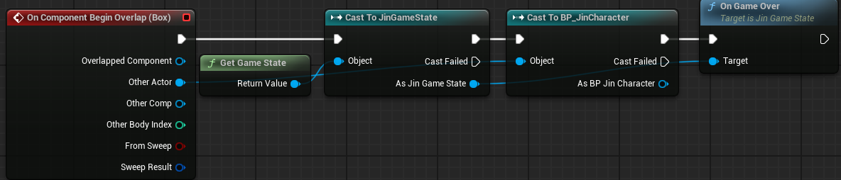 에디터의 BP_JinGameState에서 GameOverTriggerClass에 BP_GameOverTrigger를 넣어줬다.