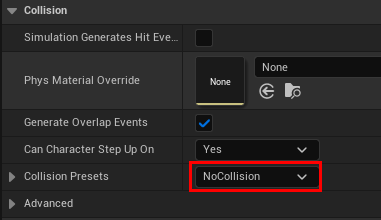 스태틱 메시의 콜리전을 No Collision으로 설정하고 Box콜리전에 닿으면 OnGameOver 함수가 호출되도록 구현했다.