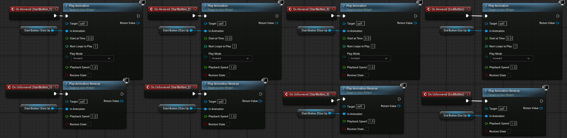 위젯 블루프린트 이벤트 그래프에서 각 버튼마다 마우스를 올리면 애니메이션을 재생, 마우스를 내리면 애니메이션을 역재생하도록 만들었다.