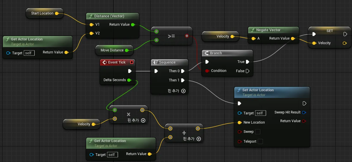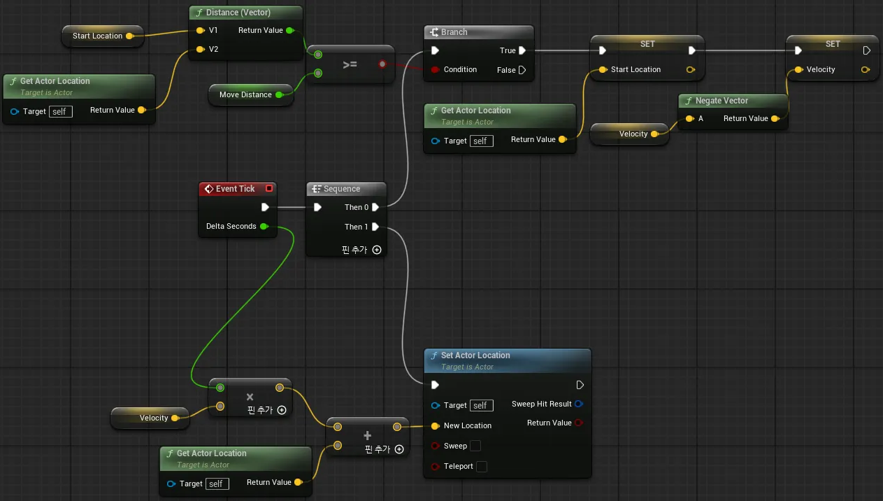 - 돌아가기 위해 Velocity를 Negate Vector 노드를 이용하여 반전 시켜준다.