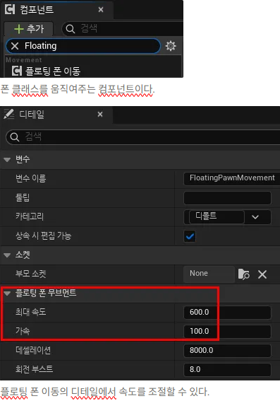 3. FloatingPawnMovement 컴포넌트를 추가한다.