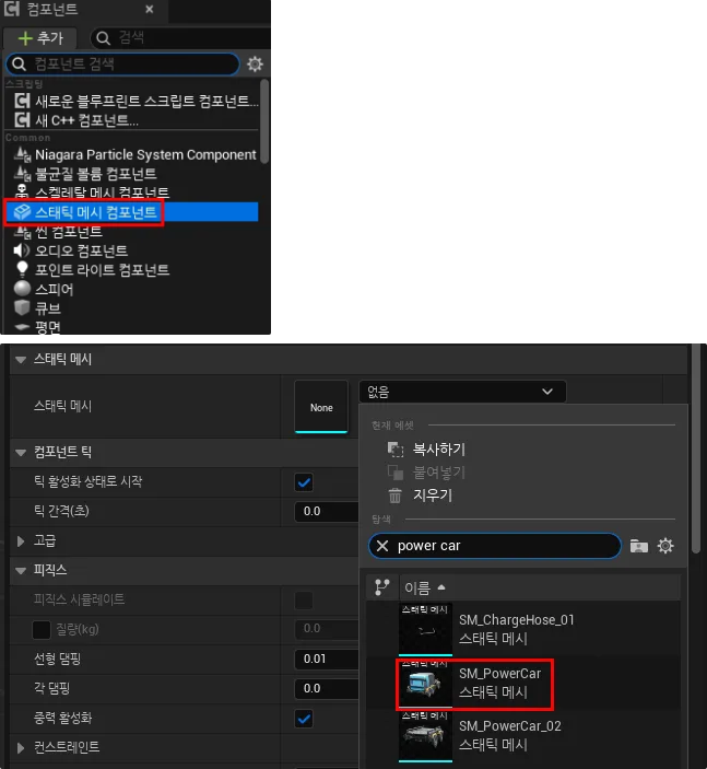 2. 스태틱 메시 컴포넌트 추가하고 디테일 - 스태틱 메시에 Power Car를 넣어준다.