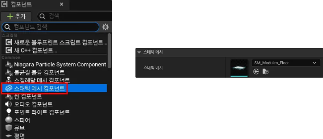 2. 블루프린트에서 스태틱 메시 컴포넌트를 추가하고 디테일 - 스태틱 메시에 floor을 넣어준다.