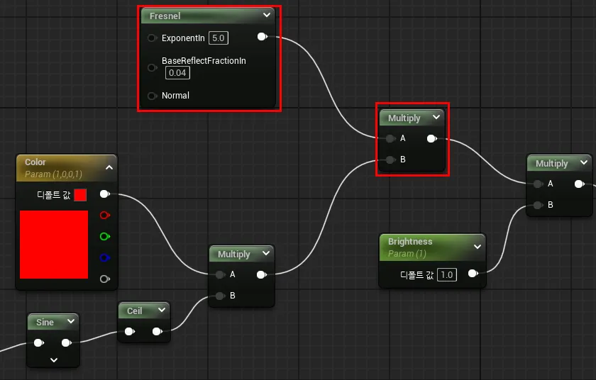 9. 현재 빨간색이 서서히 켜졌다 서서히 꺼지고 있는데 아예 꺼졌다 켜졌다를 하려면 Ceil(천장)노드를 이용을 한다.