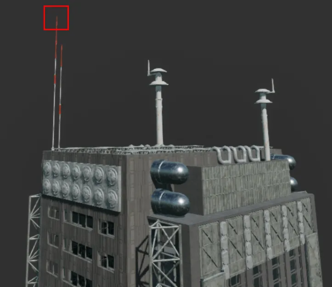 15. 빌딩 애셋을 실행하고 옥상의 안테나 끝에 안전등을 설치한다.