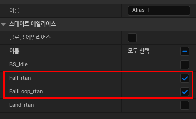 떨어지거나 떨어진상태 루프의 애님에서 착지 애님이 연결되도록 에일리어스를 추가하여 연결해준다.