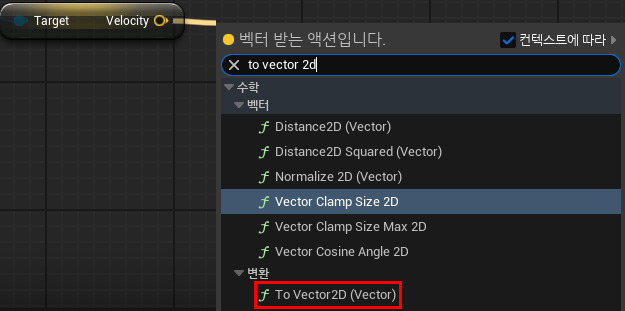 Velocity의 값중 Z값은 필요가 없으므로 To Vector 2D 노드를 이용하여 X, Y값만 받도록 한다.