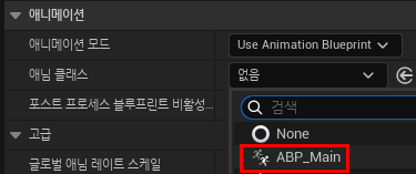 애니메이션 블루프린트를 생성하고 캐릭터에 ABP_Main를 적용시켜준다.