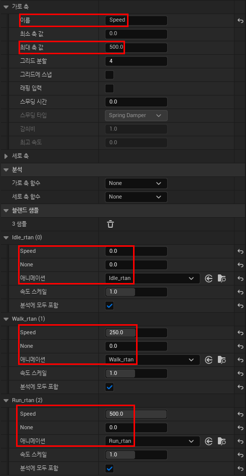 X축의 이름을 Speed로 수정하고 Idle, Walk, Run 애님을 각 속도 값을 넣어 배치해준다.