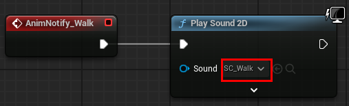 Play Sound 2D를 생성하고 사운드 애셋을 만들어 둔 SC_Walk로 넣어준 후 연결한다.