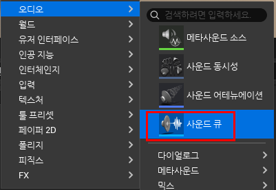 콘텐츠 브라우저에서 우클릭 하여 오디오 - 사운드 큐 를 생성한다.
