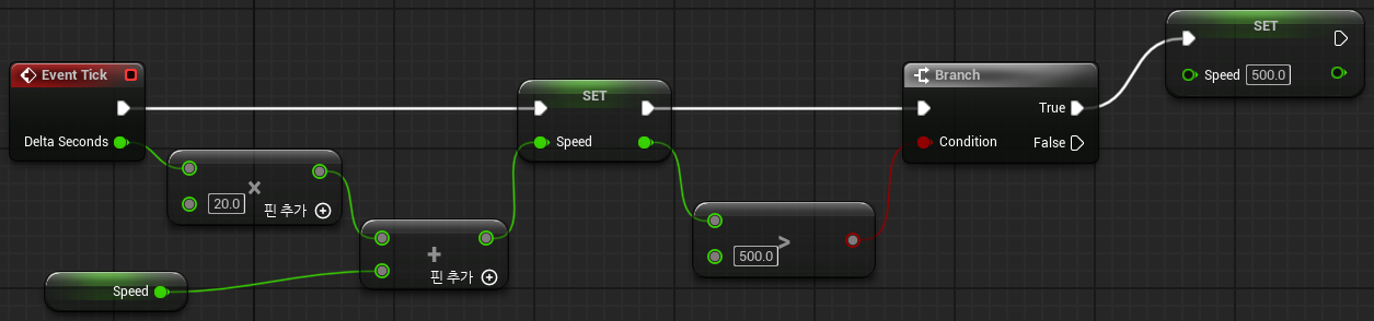 AI 캐릭터의 블루프린트에서 플로트 변수 Speed를 만들고 초기속도 200, 1초에 20씩 최대 500까지 증가하도록 구현하자.