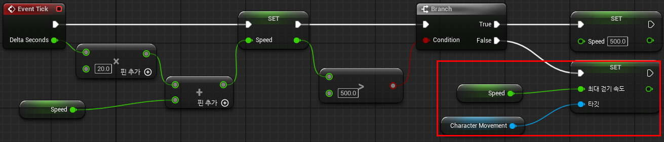 캐릭터 무브먼트의 최대 걷기 속도(Set Max Walk Speed 노드)에 변수 Speed 값을 넣는다.