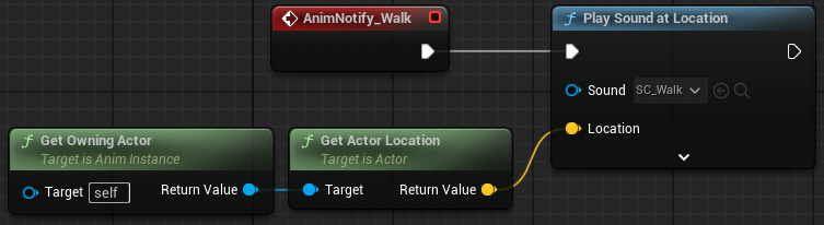 애니메이션 블루프린트에서 Play Sound 2D를 Play Sound at Location 노드로 변경하고 사운드 에셋을 넣고 Location에 이 애님 인스턴스를 가지고 있는 액터(캐릭터와 AI캐릭터를 뜻함)의 위치 값을 넣어준다.