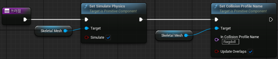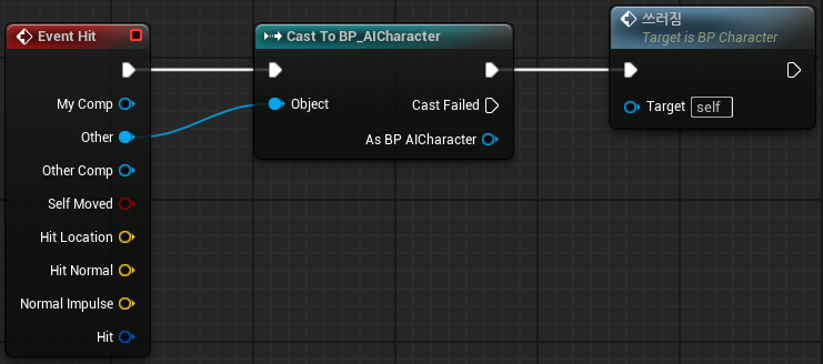전 강의에서 AI가 캐릭터를 쫓아오는 것 까지만 구현했지만 이후에 닿으면 캐릭터가 쓰러지도록 구현했다.