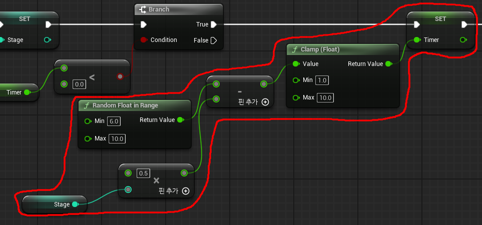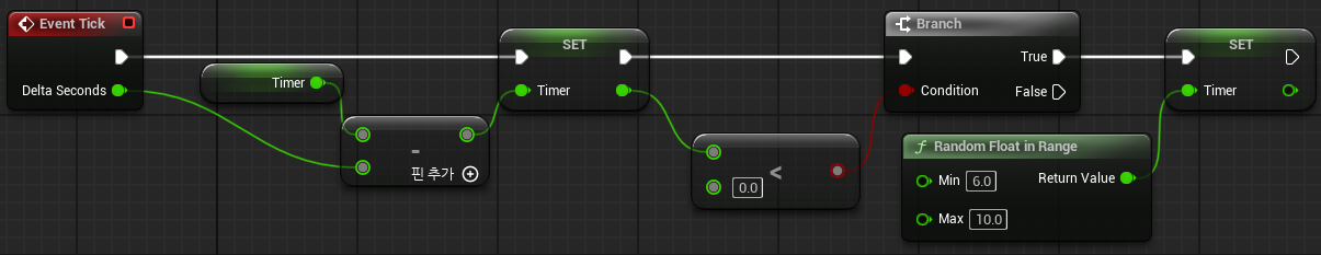 레벨 블루프린트에서 플롯 변수 Timer를 생성하고 게임 실행 시 Timer에 6에서 10 랜덤 실수를 넣도록 구현한다.