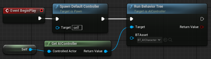 AI 블루프린트로 가서 BeginPlay에 Spawn Default Controller를 생성한다. 폰에 기본 컨트롤러를 생성하는 노드이다.
