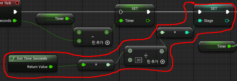 레벨 블루프린트에서 인티저 변수 Stage를 생성하고 Stage가 20초마다 1씩 증가하는 로직을 구현한다.