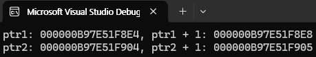 cout << "ptr2: " << (void*)ptr2 << ", ptr2 + 1: " << (void*)(ptr2 + 1) << endl;