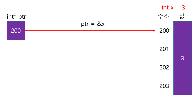 ptr = &x 즉 ptr이라는 포인터 변수에 x의 주소값을 저장합니다. 따라서 x의 시작 주소 200이 저장됩니다.