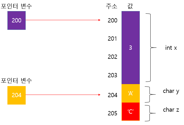 시작 주소가 200인 것은 알았지만 정수 변수 X의 크기(4바이트) 정보는 알 수 없습니다. X에 저장된 값 3을 제대로 읽으려면 시작 주소부터 4바이트를 읽어야 하므로, 포인터에는 변수의 크기 정보를 파악할 수 있는 타입 정보가 함께 필요합니다.