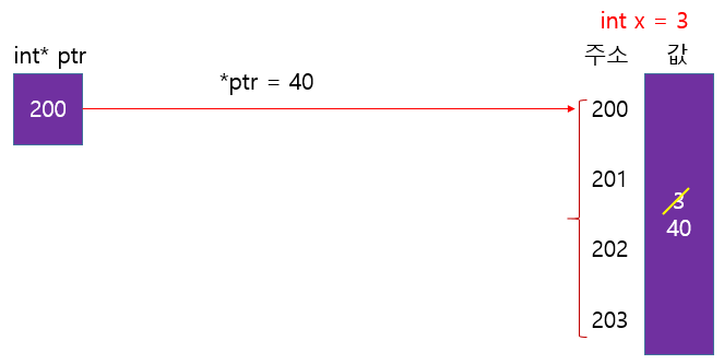 *ptr = 40하면 ptr이 담고 있는 주소값으로 가서 값을 40으로 변경합니다.