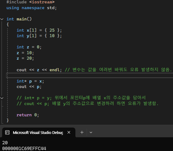 이러한 이유로 변수는 값을 저장한 후 다른 값으로 변경해도 문제가 없었지만 배열의 시작 주소는 포인터에 담으면 다른 주소값으로 변경이 불가능하다.(상수 포인터가 된다.)