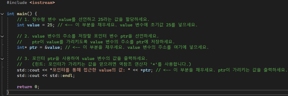 std::cout << "포인터를 통해 접근한 value의 값: " << ___; // <-- 이 부분을 채우세요. ptr이 가리키는 값을 출력하세요.