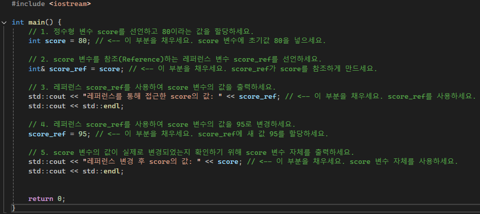 int& score_ref = ___; // <-- 이 부분을 채우세요. score_ref가 score를 참조하게 만드세요.