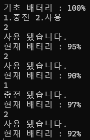 cout << "기초 배터리 : " << life.base() << "%" << endl << "1.충전 2.사용" << endl;