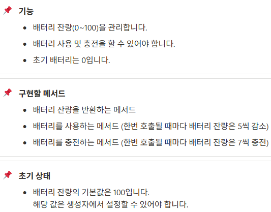 1. 초기 배터리 값을 넣을 battery 정수형 변수를 선언하고 생성자 함수에 battery에 값 100을 넣는다.
