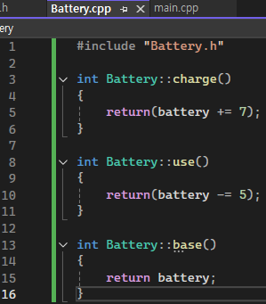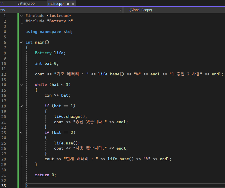 2. 배터리 충전 시 함수, 사용 시, 현재 배터리 잔량을 표시할 함수 3가지를 선언 한다.