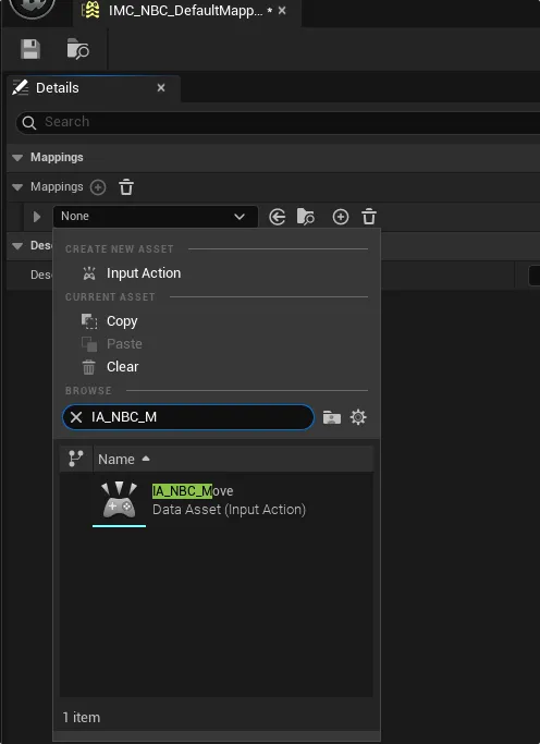4. Move 값을 어떤 키로 처리할 것인지 설정하기 위해 IMC_NBC_DefaultMappingContext로 가서 저장한 Move 인풋 액션을 넣어준다.