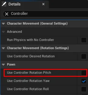 캐릭터 디테일에서 Pitch와 Yaw 회전이 가능하게 하면 마우스를 돌릴때 캐릭터 자체가 돌아가버린다.