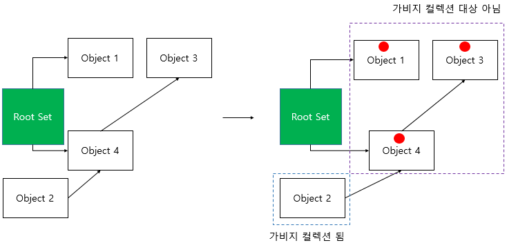- 먼저 루트셋에 포함된 객체들을 식별합니다. 이 객체들은 항상 살아있다고 간주되는 특별한 객체입니다.