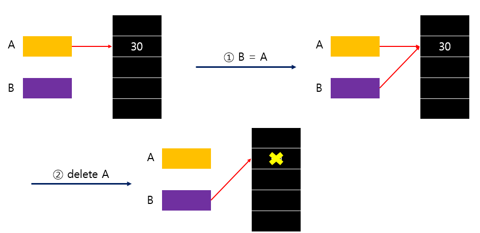 // 이제 B는 Dangling Pointer(해제된 메모리를 가리키는 포인터)