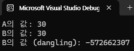 cout << "B의 값 (dangling): " << *B << endl; // 위험: 정의되지 않은 동작