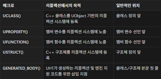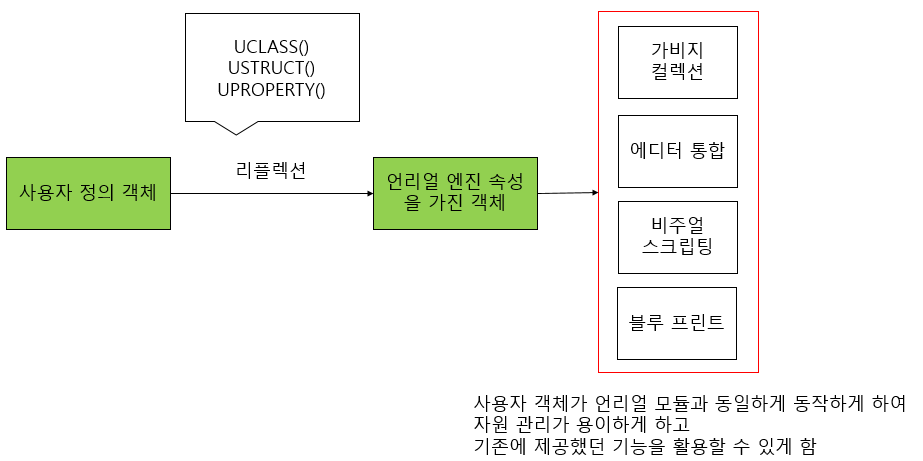 => 리플렉션 이라는 기능을 통해 C++에서 사용자가 정의한 객체를 언리얼 모듈에서 동일하게 동작하게 해서 자원 관리가 용이하게 하고 기존에 제공했던 기능을 활용할 수 있게 한다.