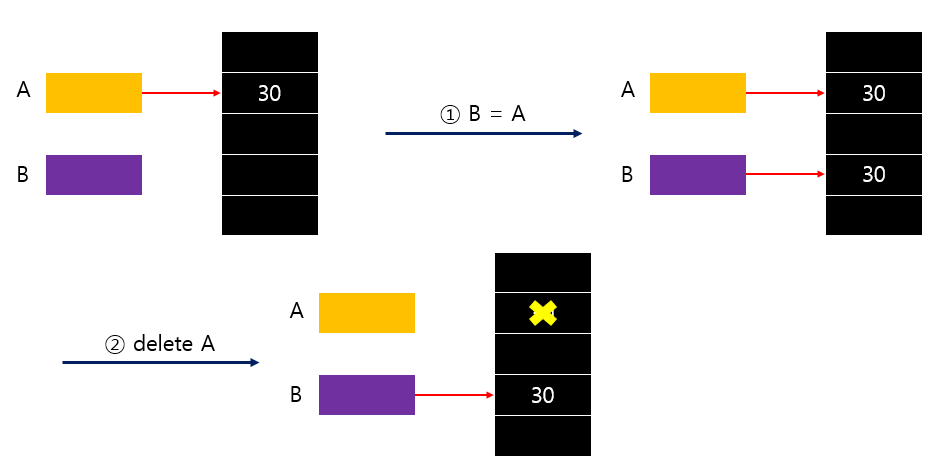 // 포인터 B가 A가 가리키는 메모리를 공유
