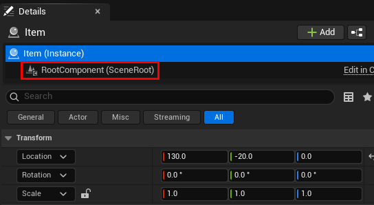 빌드 후 언리얼 에디터에서 확인해보면 Item 액터에 SceneRoot 이름의 씬 컴포넌트가 생성된 걸 볼 수 있다.